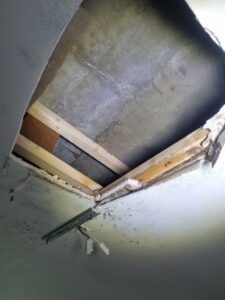처음 현장에 도착했을 때는 아래층 천장에 물자국이 퍼져 있었고, 그 어느 곳도 명확한 파손 흔적을 보여주지 않았습니다.